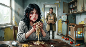 She was eating fast—too fast—like she hadn’t eaten in days. Between bites, she wiped tears from her face. Every few seconds, she glanced nervously toward the door, as if she was afraid someone might catch her.
