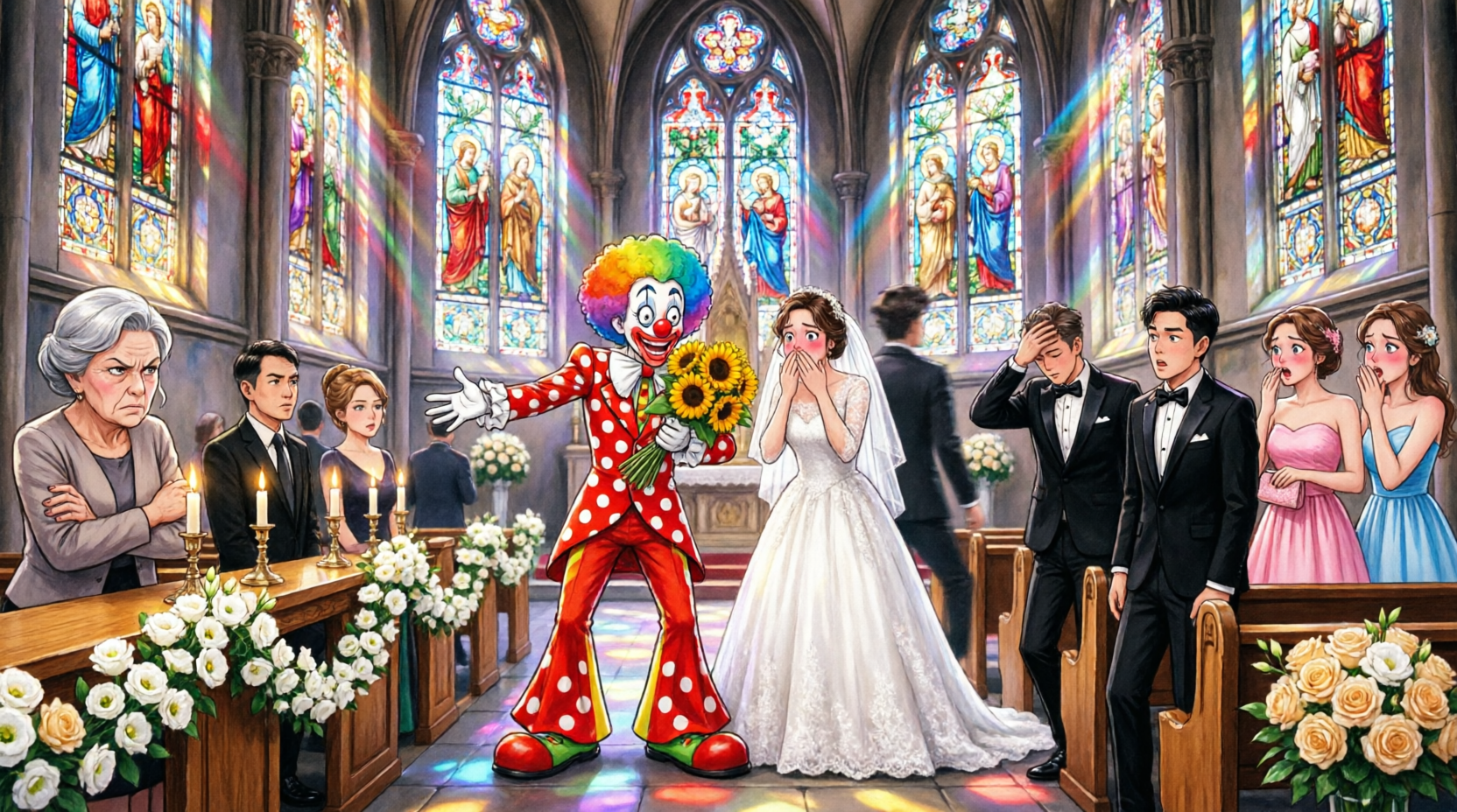 Emma, what long story? Just walk with me. Please trust me. He looked at my face, saw my determination, nodded. Okay, let’s do this. The doors opened, the music changed to the bridal march, and I stepped into view. The gasps were immediate, audible, shocked. I walked down the aisle, head high, smiling, in a clown costume with perfect hair and makeup, holding a bouquet of white roses. I saw Patricia in the front row.