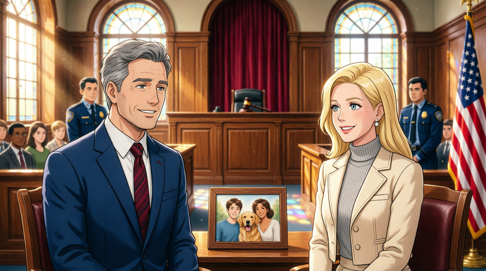 Then the bailiff continued, voice ringing cleanly through the courtroom: