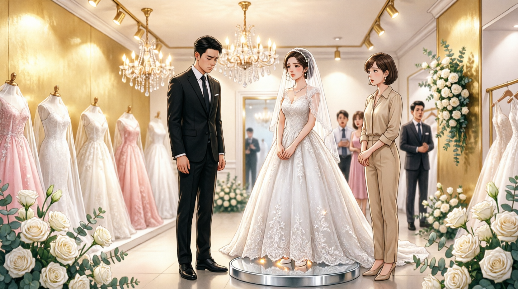 À l’intérieur, l’air était chargé de parfum, de vapeur sur les étoffes et de cette pointe acérée de ma propre fureur montante. La conseillère qui m’avait aidée à fermer la fermeture éclair me suivit, les mains tremblantes.